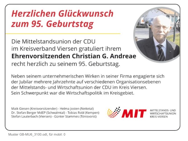Die Mittelstandsunion der CDU Kreisverband Viersen gratuliert ihrem