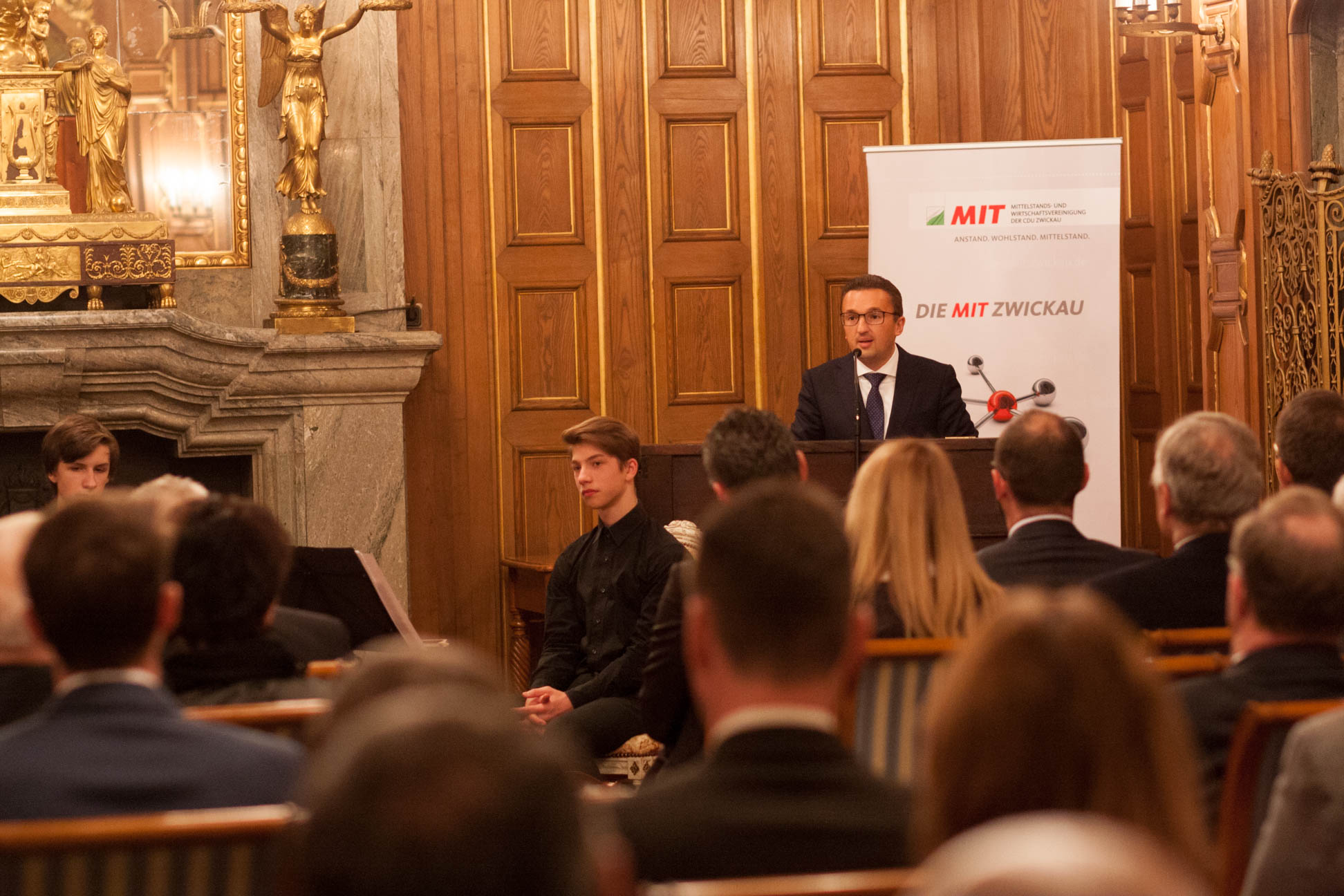 Bereits zum zweiten Mal lud die MIT Zwickau gemeinsam mit den ansässigen CDU-Stadtverbänden Glauchau, Meerane und Waldenburg sowie den Ortsverbänden Callenberg und Remse-Oberwiera-Schönberg zum Neujahrsempfang ein. Nachdem die MIT Zwickau das Jahr 2016 bei der Spedition WECK + POLLER in Zwickau begrüßt hatte, sollte 12. Januar 2017 im Schloss Waldenburg ein Blick voraus auf das Jahr 2017 geworfen werden. Die MIT möchte Unternehmerinnen und Unternehmer der Region zusammenbringen. Zudem möchte sie den Kontakt mit den Stadt- und Ortsverbänden herstellen – also den Personen, die die Politik vor Ort in den Städten und Gemeinden gestalten und Verantwortung tragen. Neben dem Zwickauer Bundestagsabgeordneten und MIT-Kreisvorsitzenden Carsten Körber waren auch der CDU-Kreisvorsitzende und Bundestagsabgeordnete Marco Wanderwitz, Landrat Dr. Christoph Scheurer, dessen Beigeordneten Angelika Hölzel und Carsten Michaelis, die Landtagsabgeordnete Ines Springer, sowie der Werdauer Oberbürgermeister Stefan Czarnecki und der Callenberger Bürgermeister Daniel Röthig vor Ort. In seiner Neujahrsansprache ging Carsten Körber auf das - für ganz Europa - wegweisende Jahr 2017 ein und legte dabei seine Vorstellungen von einer gesunden, demokratisch-freiheitlichen Gesellschaftsordnung dar. „Viele meinen, dass unsere politische Ordnung so, wie wir sie kennen, völlig selbstverständlich ist. Ich meine: Dem ist nicht so! Schneller als einem lieb ist, kann sich von heute auf morgen alles ändern“, so Körber. Als Beispiele führte er den Austritt des Vereinigten Königreichs aus der Europäischen Union und die Wahl Donald Trumps zum Präsidenten der Vereinigten Staaten von Amerika an. Körber weiter: „Die vernünftige aber oftmals schweigende Mehrheit kann noch so groß sein. Wenn sie in den gesellschaftlichen Debatten schweigt und nicht zur Wahl geht, nützt diese Vernunft niemandem etwas.“ Von den Unternehmern wünscht sich der MIT-Vorsitzende, der sich im Bundestag im Parlamentskreis Mittelstand engagiert, dass sie sich in die gesellschaftliche Debatte einbringen und den Mund aufmachen. Äußerungen von Unternehmern könnten eine große Unterstützung für Wirtschaftspolitiker sein. Abschließend rief Körber die etwa 80 Gäste aus Politik und Wirtschaft dazu auf, sich nicht in eine sogenannte postfaktische Debatte drängen zu lassen, in der jeder nur das sieht, was er sehen will. Bei der Wahrheit bleiben, Fakten sprechen lassen – so sehe ein Diskurs aus. Und ein solcher, differenzierter Diskus sei Voraussetzung für eine funktionierende demokratische Streitkultur - mit Argumenten, nicht mit Stimmungen. Musikalisch untermalt wurde der Abend im Schloss Waldenburg von einem Cello-Quartett des Robert Schumann Konservatoriums der Stadt Zwickau, das 2017 sein 70. Jubiläum feiert. Neben lockeren Gesprächen und kulinarischen Angeboten des Landgasthauses und Hotels Beierleins aus Callenberg, nutzten viele Gäste die Möglichkeit, bei einem geführten Rundgang Interessantes über die Geschichte und Projekte des Schlosses Waldenburg zu erfahren.