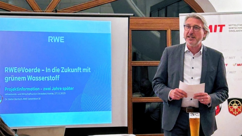 Bei der gut besuchten Veranstaltung informierte Dr. Stefan Berrisch, Leiter Anlagengenehmigung und Umweltschutz der RWE Power AG, über den aktuellen Stand der Planungen für ein Wasserstoffkraftwerk in Möllen auf dem Gelände des ehemaligen Steinkohlenkraftwerkes. Das Projekt gilt als wichtiger Baustein für die Versorgungssicherheit energieintensiver Industrien wie Stahl, Zement und Glas. Wasserstoff ist ein Schlüssel für die Versorgungssicherheit energieintensiver Branchen und für die Zukunft des Industriestandorts Deutschland.
